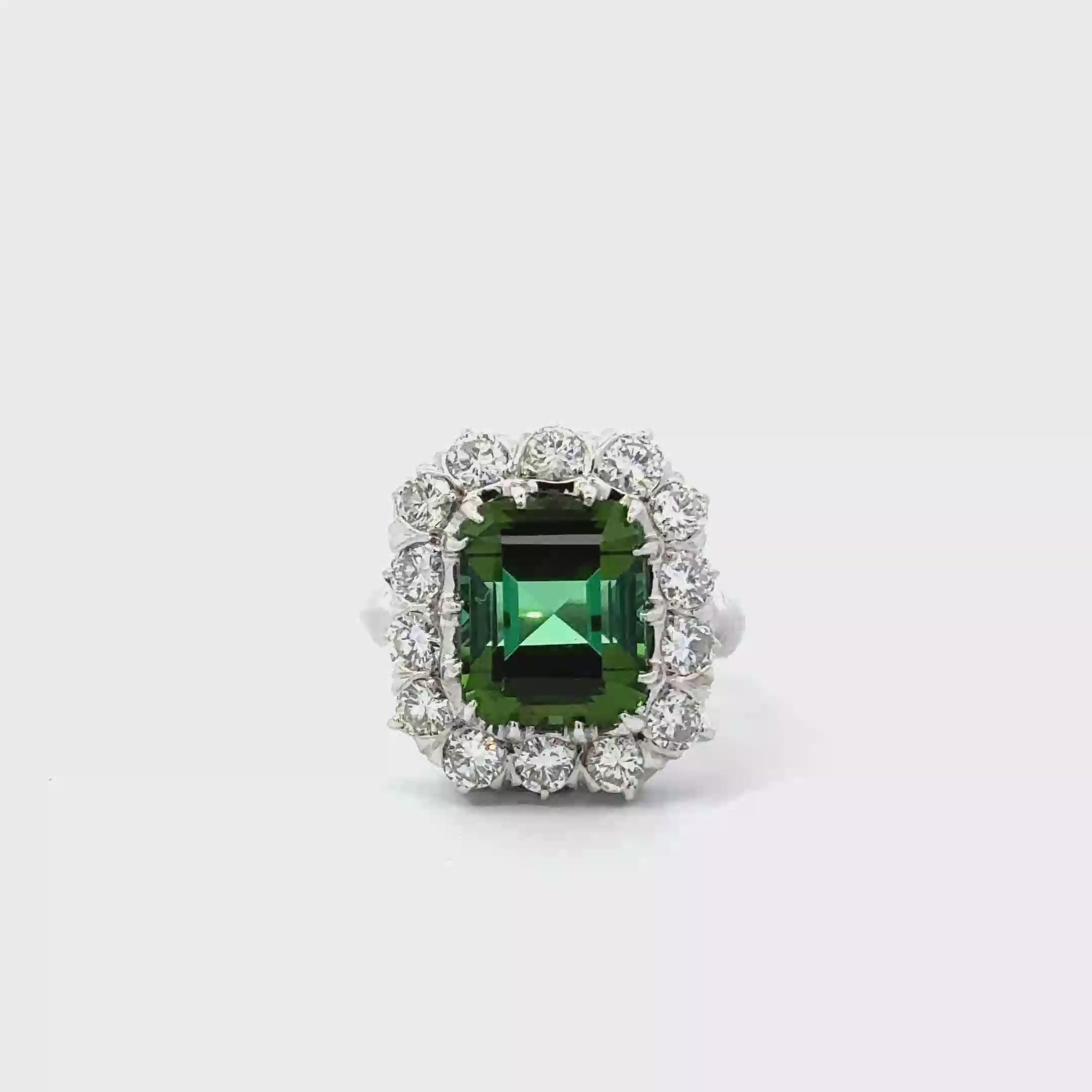 Exquisite 14 karat white gold cocktail ring showcasing a captivating emerald-cut lagoon tourmaline. The step-cut style enhances the tourmaline's vibrant green hue, creating a mesmerizing play of light. A statement piece that exudes elegance and sophistication.