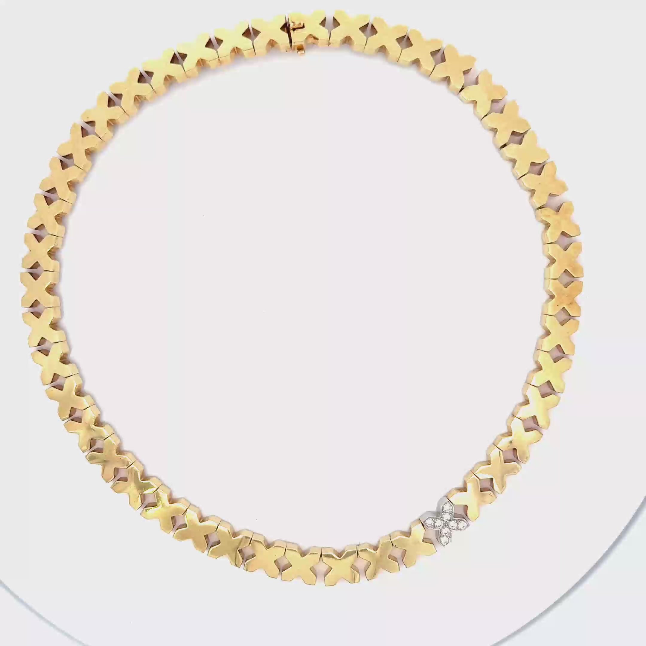 Elevate your style with this exquisite vintage 18 karat yellow gold Tiffany & Co. necklace. The chain is intricately designed with interconnected X-shaped links. A single off center X link in white gold is set with eight round brilliant diamonds for a modern look a touch of timeless sparkle. Made in the 1980's.